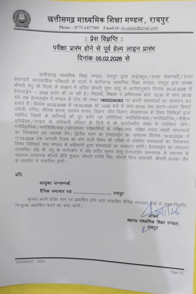 Raipur. The Chhattisgarh Board of Secondary Education (CGBSE) has decided to launch a helpline for students ahead of the 10th and 12th board exams. This helpline will be active on February 5th, allowing students to seek solutions to problems related to their studies and exams.